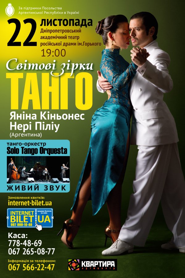 При поддержке Посольства Аргентинской Республики в Украине, представляем гастрольный тур: «Мировые звезды Танго» в Донецке, Днепропетровске и Киеве.