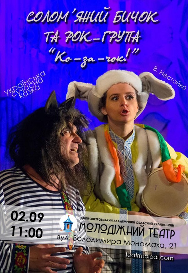 Солом'яний бичок та рок-група "Ко-за-чок" відбудеться 2 вересня 2017, 11:00, субота в Дніпропетровський академічний молодіжний театр. За допомогою сервісу internet-bilet.ua, Ви зможете з легкістю забронювати, замовити та купити квитки на концерт, спектакль, оперу, балет, майстер-класи, спортивні та дитячі заходи, що Вас цікавлять, оплативши їх найбільш зручним для Вас способом: через інтернет банківською карткою VISA/MasterCard, готівкою або кур'єром, якщо зробите замовлення квитка з доставкою.