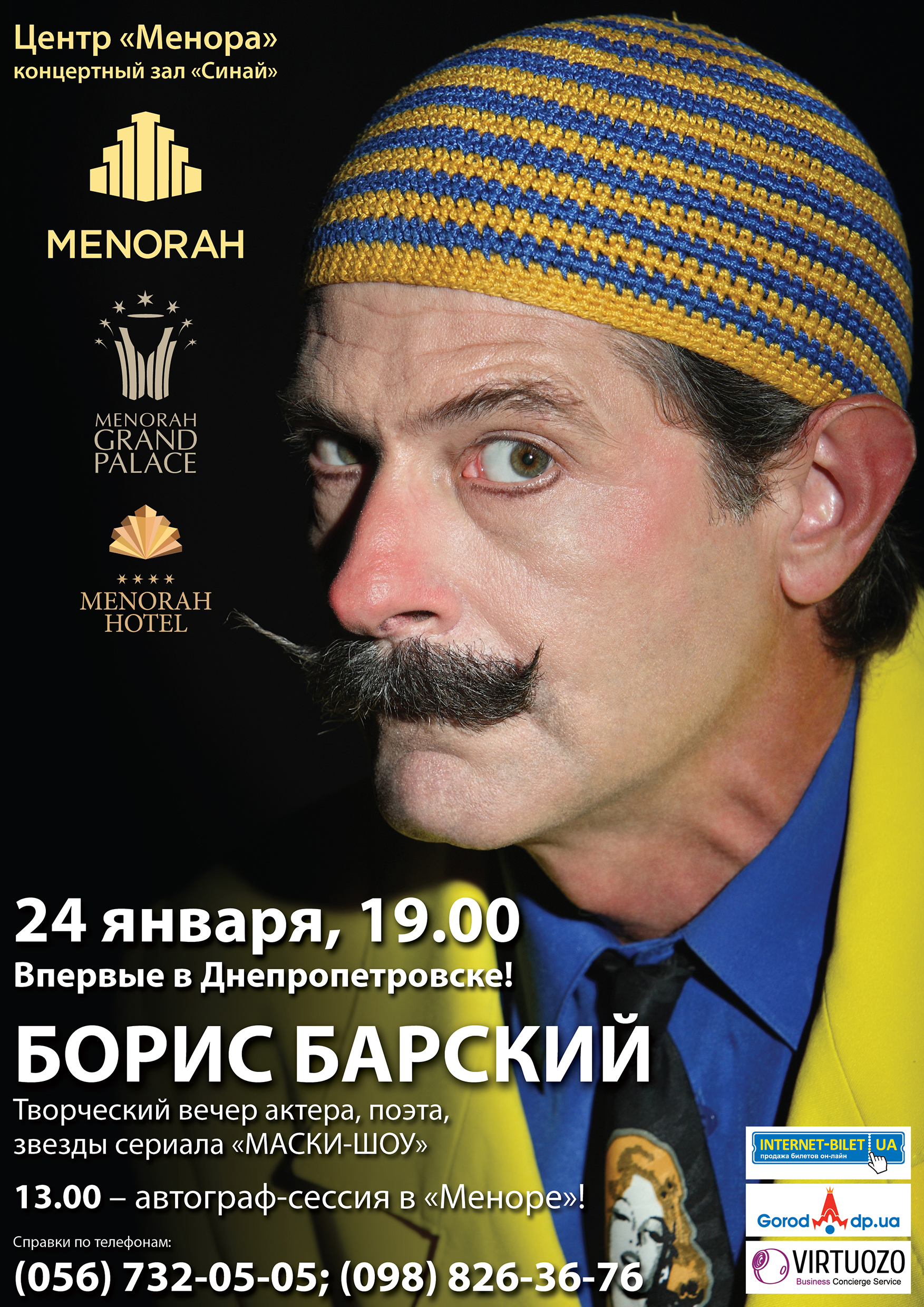 Борис Барский відбудеться 24 січня 2013, 19:00, четвер в БЦ Менора, зал "Синай". За допомогою сервісу internet-bilet.ua, Ви зможете з легкістю забронювати, замовити та купити квитки на концерт, спектакль, оперу, балет, майстер-класи, спортивні та дитячі заходи, що Вас цікавлять, оплативши їх найбільш зручним для Вас способом: через інтернет банківською карткою VISA/MasterCard, готівкою або кур'єром, якщо зробите замовлення квитка з доставкою.