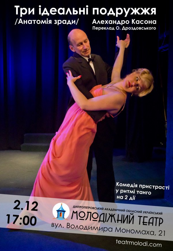 Три ідеальні подружжя відбудеться 2 грудня 2017, 17:00, субота в Дніпропетровський академічний молодіжний театр. За допомогою сервісу internet-bilet.ua, Ви зможете з легкістю забронювати, замовити та купити квитки на концерт, спектакль, оперу, балет, майстер-класи, спортивні та дитячі заходи, що Вас цікавлять, оплативши їх найбільш зручним для Вас способом: через інтернет банківською карткою VISA/MasterCard, готівкою або кур'єром, якщо зробите замовлення квитка з доставкою.
