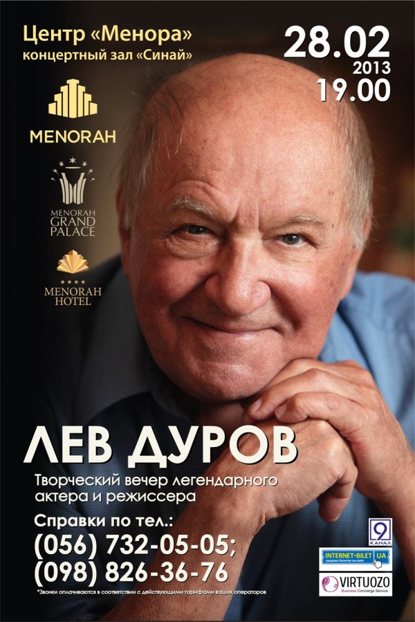 Творческий вечер народного артиста СССР Льва Дурова відбудеться 28 лютого 2013, 19:00, четвер в БЦ Менора, зал "Синай". За допомогою сервісу internet-bilet.ua, Ви зможете з легкістю забронювати, замовити та купити квитки на концерт, спектакль, оперу, балет, майстер-класи, спортивні та дитячі заходи, що Вас цікавлять, оплативши їх найбільш зручним для Вас способом: через інтернет банківською карткою VISA/MasterCard, готівкою або кур'єром, якщо зробите замовлення квитка з доставкою.