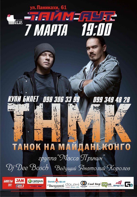 Гурт Танок на Майдані Конґо відбудеться 7 березня 2013, 19:00, четвер в Тайм Аут. За допомогою сервісу internet-bilet.ua, Ви зможете з легкістю забронювати, замовити та купити квитки на концерт, спектакль, оперу, балет, майстер-класи, спортивні та дитячі заходи, що Вас цікавлять, оплативши їх найбільш зручним для Вас способом: через інтернет банківською карткою VISA/MasterCard, готівкою або кур'єром, якщо зробите замовлення квитка з доставкою.