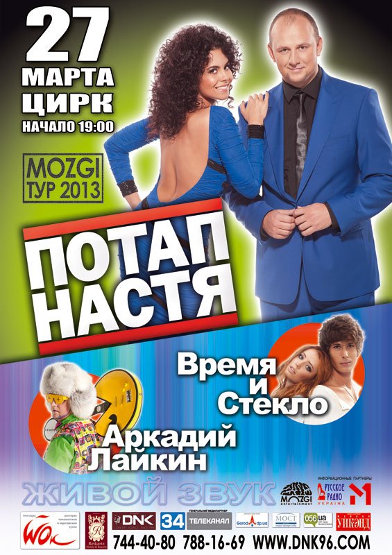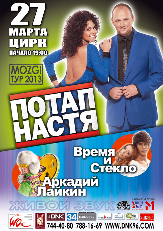 - Ни один украинский артист не может позволить себе всеукраинский тур такого масштаба, - говорит продюсер проектов Потап. – Если дуэт «Потап и Настя» три года назад уже отправлялся в тур по стране, группа «Время и Стекло» побывают на таких грандиозных гастролях впервые. Аркадий Лайкин, все еще привыкающий к славе, пристальному вниманию папарацци и толпе фанаток, вообще не может поверить в участие в таком крутом туре и не придумал до сих пор, как будет расплачиваться со мной за столь высоко оказанную честь как для новичка! (Смеется) Мы с нетерпением ждем новых встреч с любимыми украинскими поклонниками! Развлеки MOZGI – приходи на самый незабываемый концерт от лучших звезд отечественного шоу-бизнеса в своем городе!Встречайте!Самый успешный,популярный,гостролируемый и востребованный дуэт "Потап и Настя".
