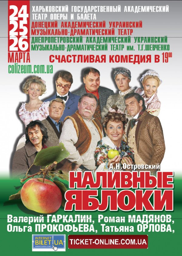 Спектакль "Наливные яблоки" відбудеться 26 березня 2013, 19:00, вівторок в Дніпровський національний академічний український музично-драматичний театр ім. Т.Г. Шевченка. За допомогою сервісу internet-bilet.ua, Ви зможете з легкістю забронювати, замовити та купити квитки на концерт, спектакль, оперу, балет, майстер-класи, спортивні та дитячі заходи, що Вас цікавлять, оплативши їх найбільш зручним для Вас способом: через інтернет банківською карткою VISA/MasterCard, готівкою або кур'єром, якщо зробите замовлення квитка з доставкою.