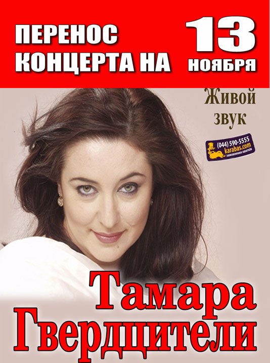 Тамара Гвердцители відбудеться 13 листопада 2013, 19:00, середа в Дніпровський академічний театр опери та балету. За допомогою сервісу internet-bilet.ua, Ви зможете з легкістю забронювати, замовити та купити квитки на концерт, спектакль, оперу, балет, майстер-класи, спортивні та дитячі заходи, що Вас цікавлять, оплативши їх найбільш зручним для Вас способом: через інтернет банківською карткою VISA/MasterCard, готівкою або кур'єром, якщо зробите замовлення квитка з доставкою.