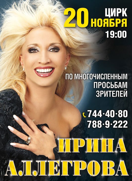 По многочисленным просьбам зрителей! 20 ноября, в помещении цирка, с новыми и лучшими хитами - Ирина Аллегрова.