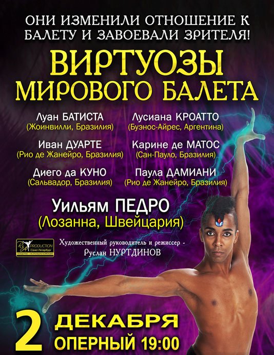 Виртуозы мирового балета відбудеться 2 грудня 2013, 19:00, понеділок в Дніпровський академічний театр опери та балету. За допомогою сервісу internet-bilet.ua, Ви зможете з легкістю забронювати, замовити та купити квитки на концерт, спектакль, оперу, балет, майстер-класи, спортивні та дитячі заходи, що Вас цікавлять, оплативши їх найбільш зручним для Вас способом: через інтернет банківською карткою VISA/MasterCard, готівкою або кур'єром, якщо зробите замовлення квитка з доставкою.