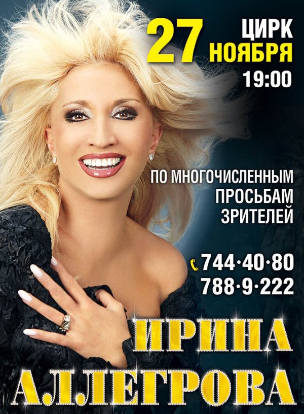 По многочисленным просьбам зрителей!!! 27 ноября,в помещении Цирка, с новыми и лучшими хитами - Ирина Аллегрова!!!