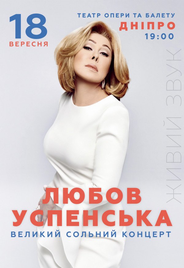 Любов Успенська відбудеться 18 вересня 2021, 19:00, субота в Дніпровський академічний театр опери та балету. За допомогою сервісу internet-bilet.ua, Ви зможете з легкістю забронювати, замовити та купити квитки на концерт, спектакль, оперу, балет, майстер-класи, спортивні та дитячі заходи, що Вас цікавлять, оплативши їх найбільш зручним для Вас способом: через інтернет банківською карткою VISA/MasterCard, готівкою або кур'єром, якщо зробите замовлення квитка з доставкою.