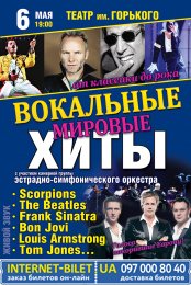 Вокальные мировые хиты відбудеться 6 травня 2015, 19:00, середа в Дніпровський академічний театр драми та комедії. За допомогою сервісу internet-bilet.ua, Ви зможете з легкістю забронювати, замовити та купити квитки на концерт, спектакль, оперу, балет, майстер-класи, спортивні та дитячі заходи, що Вас цікавлять, оплативши їх найбільш зручним для Вас способом: через інтернет банківською карткою VISA/MasterCard, готівкою або кур'єром, якщо зробите замовлення квитка з доставкою.