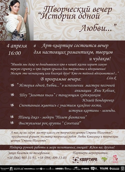 Творческий вечер "История одной любви..." відбудеться 4 квітня 2015, 16:00, субота в АРТ-ЦЕНТР "КВАРТИРА". За допомогою сервісу internet-bilet.ua, Ви зможете з легкістю забронювати, замовити та купити квитки на концерт, спектакль, оперу, балет, майстер-класи, спортивні та дитячі заходи, що Вас цікавлять, оплативши їх найбільш зручним для Вас способом: через інтернет банківською карткою VISA/MasterCard, готівкою або кур'єром, якщо зробите замовлення квитка з доставкою.