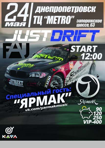 24 мая состоится уникальное событие! Открытие автомобильного фестиваля "JUST DRIFT"!!! Впервые в Украине,профессионалы и любители буду участвовать в рамках одного мероприятия и единой системы судейства! "JUST DRIFT"- единственный фестиваль,который даёт возможность любителям испытать себя на профессиональной трассе рядом с топовыми пилотами Украины! В рамках фестиваля пройдёт "after-party",гостем которого станет всеми известный репер "ЯрмаК"( http://vk.com/yarmakmusic )!!!!