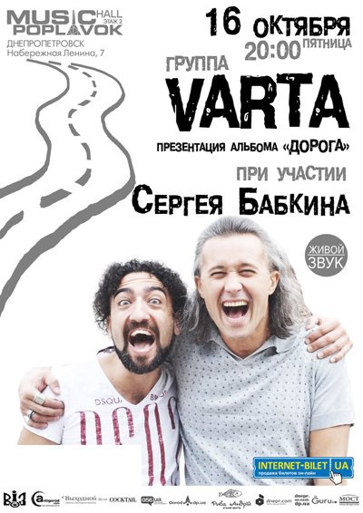 16 октября, в Поплавке, замечательная днепропетровская команда VARTA презентует свой дебютный альбом под названием "Дорога"!