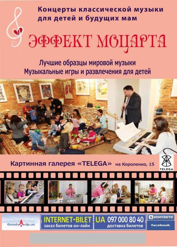 "Эффект Моцарта" відбудеться 3 жовтня 2015, 11:00, субота в Картинна галерея "Телега". За допомогою сервісу internet-bilet.ua, Ви зможете з легкістю забронювати, замовити та купити квитки на концерт, спектакль, оперу, балет, майстер-класи, спортивні та дитячі заходи, що Вас цікавлять, оплативши їх найбільш зручним для Вас способом: через інтернет банківською карткою VISA/MasterCard, готівкою або кур'єром, якщо зробите замовлення квитка з доставкою.