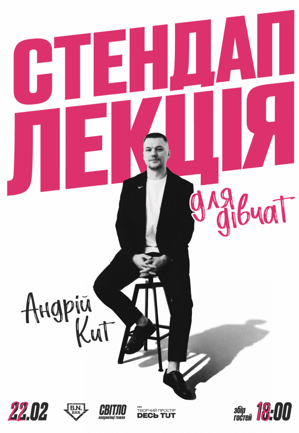Стендап лекція для дівчат від Андрія Кита відбудеться 22 лютого 2026, 18:30, неділя в Творчий простір «Десь тут». За допомогою сервісу internet-bilet.ua, Ви зможете з легкістю забронювати, замовити та купити квитки на концерт, спектакль, оперу, балет, майстер-класи, спортивні та дитячі заходи, що Вас цікавлять, оплативши їх найбільш зручним для Вас способом: через інтернет банківською карткою VISA/MasterCard, готівкою або кур'єром, якщо зробите замовлення квитка з доставкою.