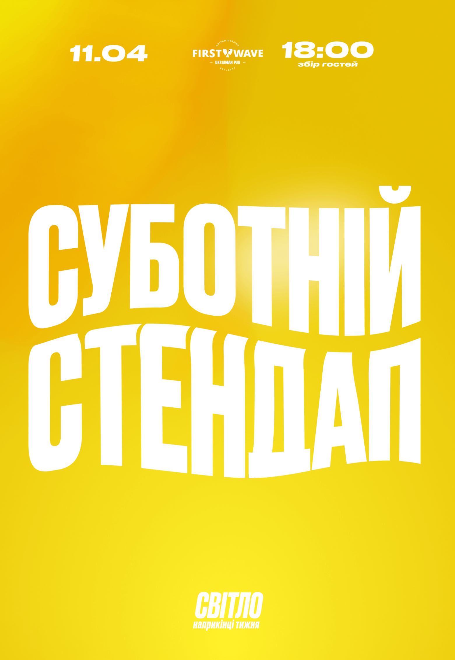 Суботній стендап відбудеться 11 квітня 2026, 18:30, субота в Stand up-простір «Світло». За допомогою сервісу internet-bilet.ua, Ви зможете з легкістю забронювати, замовити та купити квитки на концерт, спектакль, оперу, балет, майстер-класи, спортивні та дитячі заходи, що Вас цікавлять, оплативши їх найбільш зручним для Вас способом: через інтернет банківською карткою VISA/MasterCard, готівкою або кур'єром, якщо зробите замовлення квитка з доставкою.