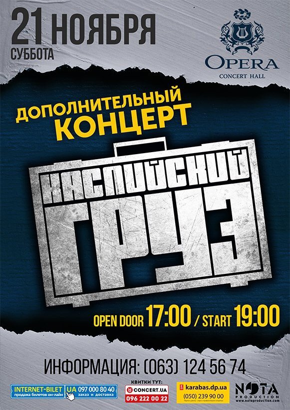 Каспийский груз 19:00 відбудеться 21 листопада 2015, 19:00, субота в Opera club. За допомогою сервісу internet-bilet.ua, Ви зможете з легкістю забронювати, замовити та купити квитки на концерт, спектакль, оперу, балет, майстер-класи, спортивні та дитячі заходи, що Вас цікавлять, оплативши їх найбільш зручним для Вас способом: через інтернет банківською карткою VISA/MasterCard, готівкою або кур'єром, якщо зробите замовлення квитка з доставкою.
