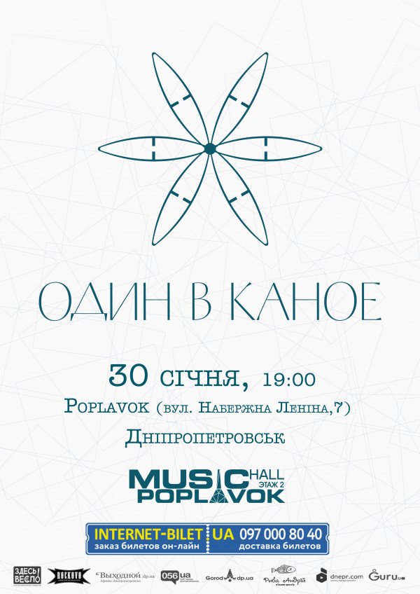 Один в каное відбудеться 30 січня 2016, 19:00, субота в Poplavok Music Hall. За допомогою сервісу internet-bilet.ua, Ви зможете з легкістю забронювати, замовити та купити квитки на концерт, спектакль, оперу, балет, майстер-класи, спортивні та дитячі заходи, що Вас цікавлять, оплативши їх найбільш зручним для Вас способом: через інтернет банківською карткою VISA/MasterCard, готівкою або кур'єром, якщо зробите замовлення квитка з доставкою.
