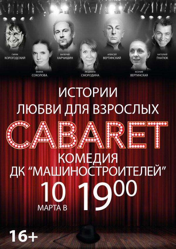 Истории любви для взрослых відбудеться 10 березня 2016, 19:00, четвер в ПК Машинобудівників. За допомогою сервісу internet-bilet.ua, Ви зможете з легкістю забронювати, замовити та купити квитки на концерт, спектакль, оперу, балет, майстер-класи, спортивні та дитячі заходи, що Вас цікавлять, оплативши їх найбільш зручним для Вас способом: через інтернет банківською карткою VISA/MasterCard, готівкою або кур'єром, якщо зробите замовлення квитка з доставкою.