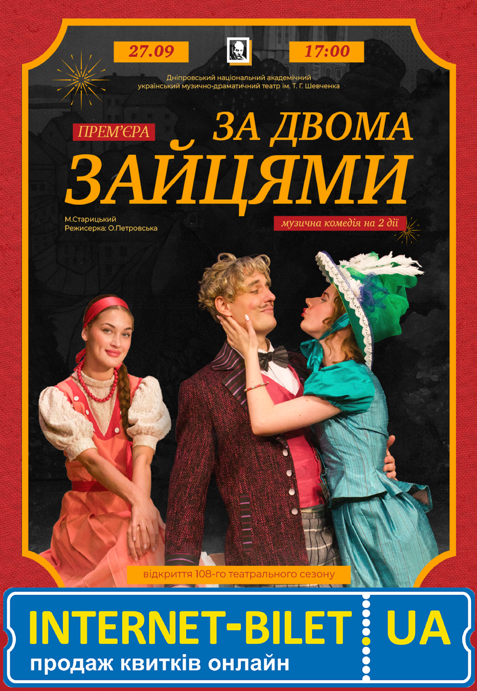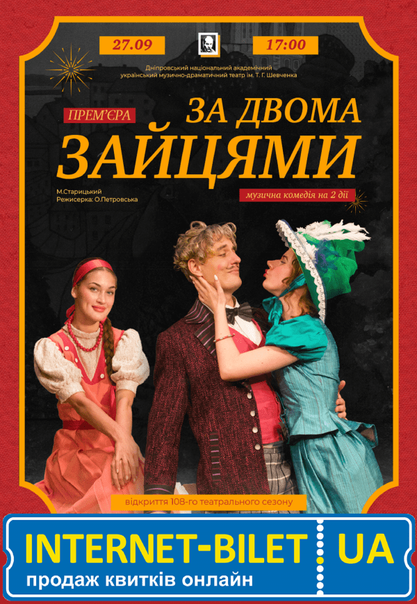 🎭 Найкраща прем’єра цієї осені вже близько! 27 вересня о 17:00 у Дніпровському національному театрі ім. Т. Г. Шевченка прем’єра музичної комедії «За двома зайцями». Ця вистава відкриває 108-й театральний сезон нашого театру та запрошує глядачів у захопливу подорож на Поділ кінця ХІХ століття.