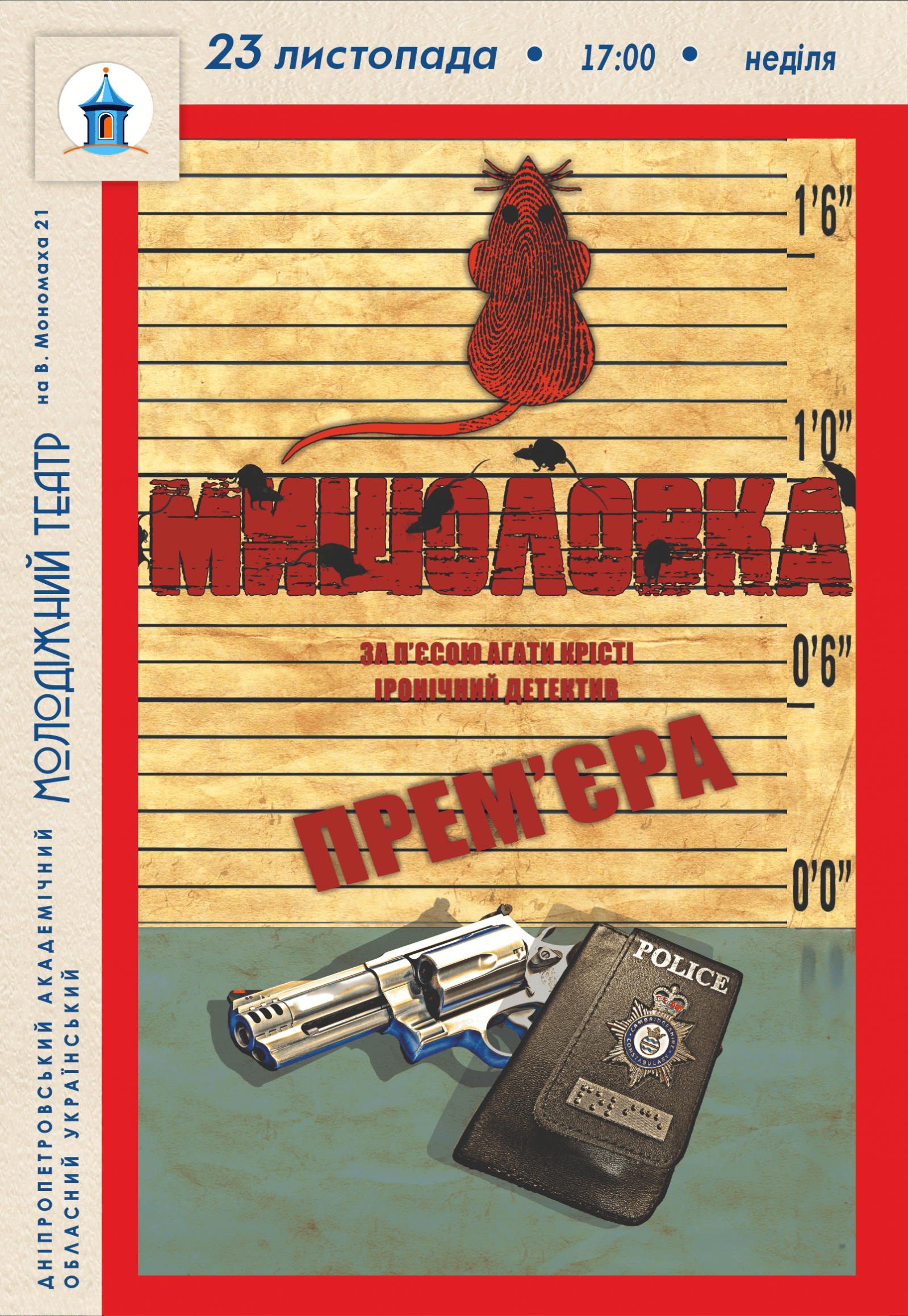 Вистава «Мишоловка». Прем'єра! відбудеться 23 листопада 2025, 17:00, неділя в Дніпропетровський академічний молодіжний театр. За допомогою сервісу internet-bilet.ua, Ви зможете з легкістю забронювати, замовити та купити квитки на концерт, спектакль, оперу, балет, майстер-класи, спортивні та дитячі заходи, що Вас цікавлять, оплативши їх найбільш зручним для Вас способом: через інтернет банківською карткою VISA/MasterCard, готівкою або кур'єром, якщо зробите замовлення квитка з доставкою.