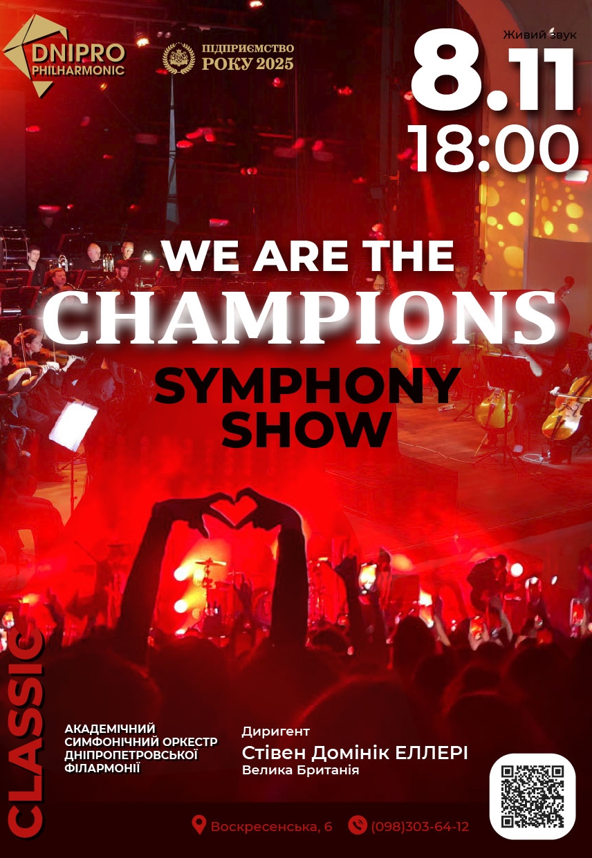 Симфонічне шоу «We Are The Champions» відбудеться 8 листопада 2025, 18:00, субота в Дніпропетровська філармонія імені Л. Б. Когана. За допомогою сервісу internet-bilet.ua, Ви зможете з легкістю забронювати, замовити та купити квитки на концерт, спектакль, оперу, балет, майстер-класи, спортивні та дитячі заходи, що Вас цікавлять, оплативши їх найбільш зручним для Вас способом: через інтернет банківською карткою VISA/MasterCard, готівкою або кур'єром, якщо зробите замовлення квитка з доставкою.