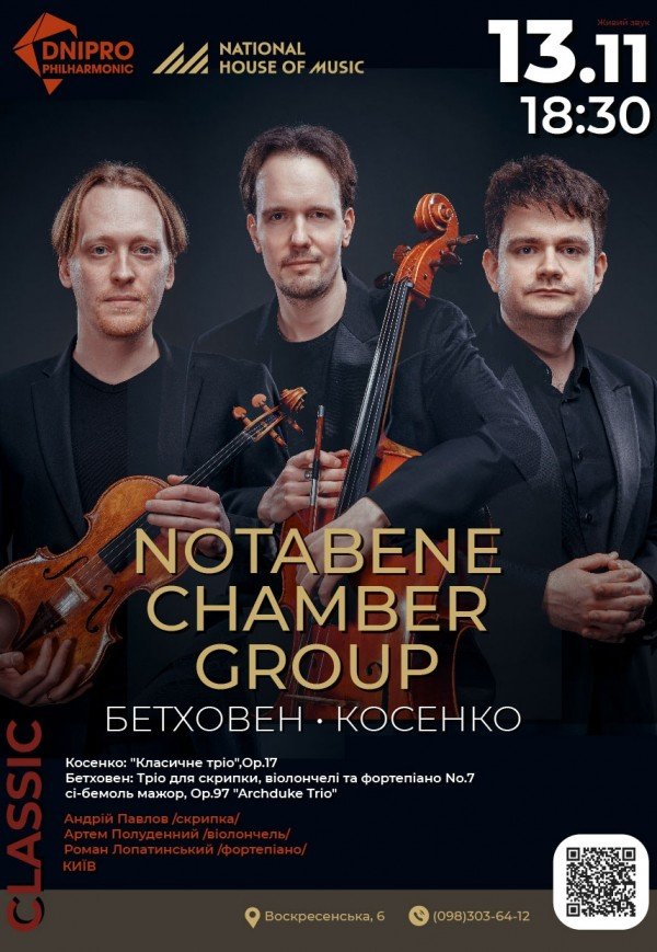 NotaBene Chamber Group. Бетховен. Косенко. відбудеться 13 листопада 2025, 18:30, четвер в Дніпропетровська філармонія імені Л. Б. Когана. За допомогою сервісу internet-bilet.ua, Ви зможете з легкістю забронювати, замовити та купити квитки на концерт, спектакль, оперу, балет, майстер-класи, спортивні та дитячі заходи, що Вас цікавлять, оплативши їх найбільш зручним для Вас способом: через інтернет банківською карткою VISA/MasterCard, готівкою або кур'єром, якщо зробите замовлення квитка з доставкою.