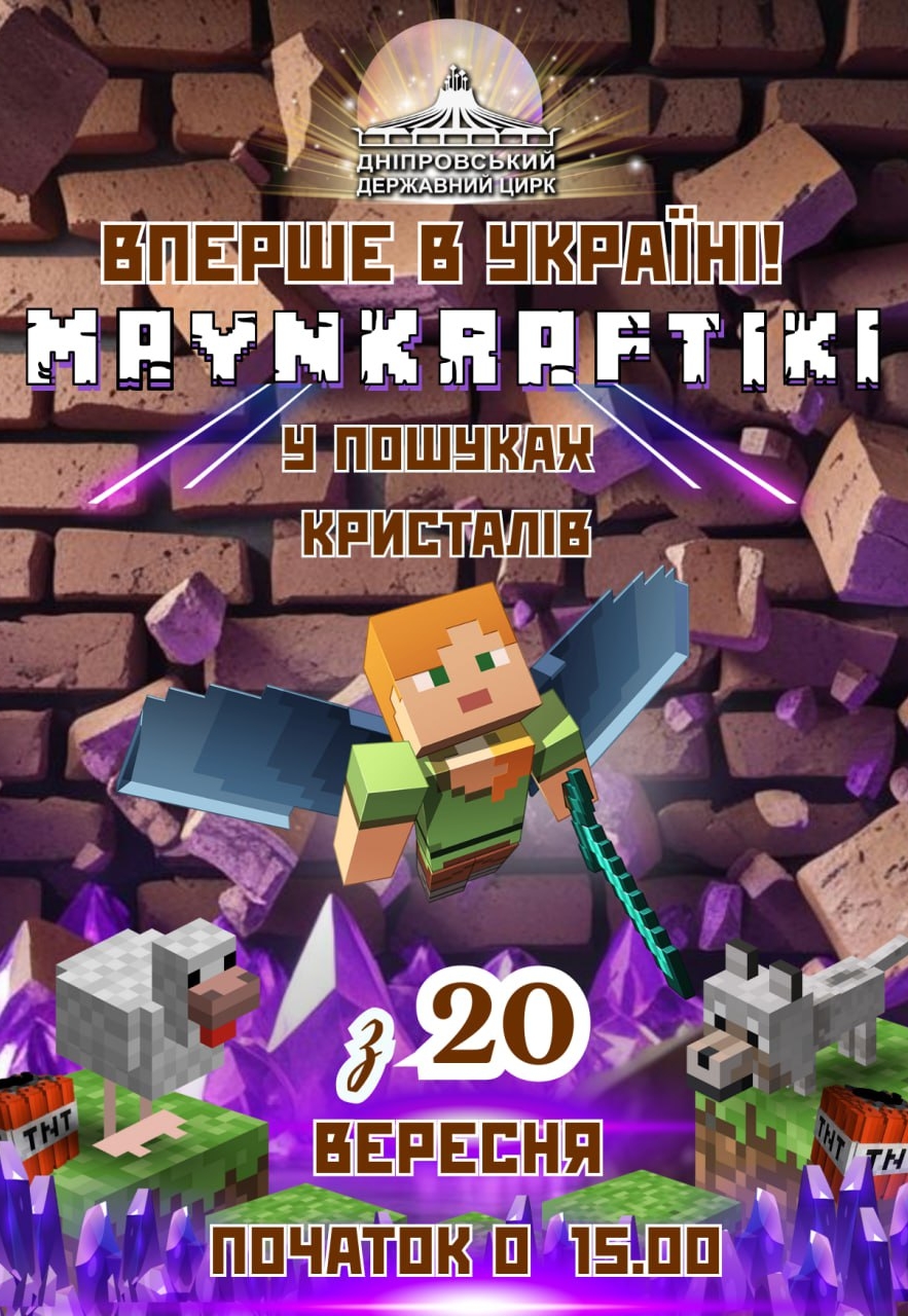 Вперше на манежі Дніпровського Цирку! Прем’єра сезону — вистава, якої ще ніхто не бачив! «Майнкрафтики в пошуках кристалів». У світі, де кожен блок має значення, з’являється нова можливість — п’ять могутніх кристалів Природи, Блискавки, Моря, Повітря та Світла можуть відкрити новий рівень сили, гармонії та єдності.