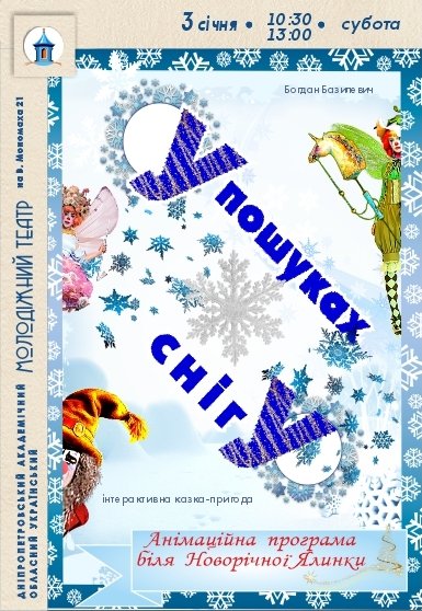 Інтерактивна казка «У пошуках снігу». Прем'єра! відбудеться 3 січня 2026, 13:00, субота в Дніпропетровський академічний молодіжний театр. За допомогою сервісу internet-bilet.ua, Ви зможете з легкістю забронювати, замовити та купити квитки на концерт, спектакль, оперу, балет, майстер-класи, спортивні та дитячі заходи, що Вас цікавлять, оплативши їх найбільш зручним для Вас способом: через інтернет банківською карткою VISA/MasterCard, готівкою або кур'єром, якщо зробите замовлення квитка з доставкою.