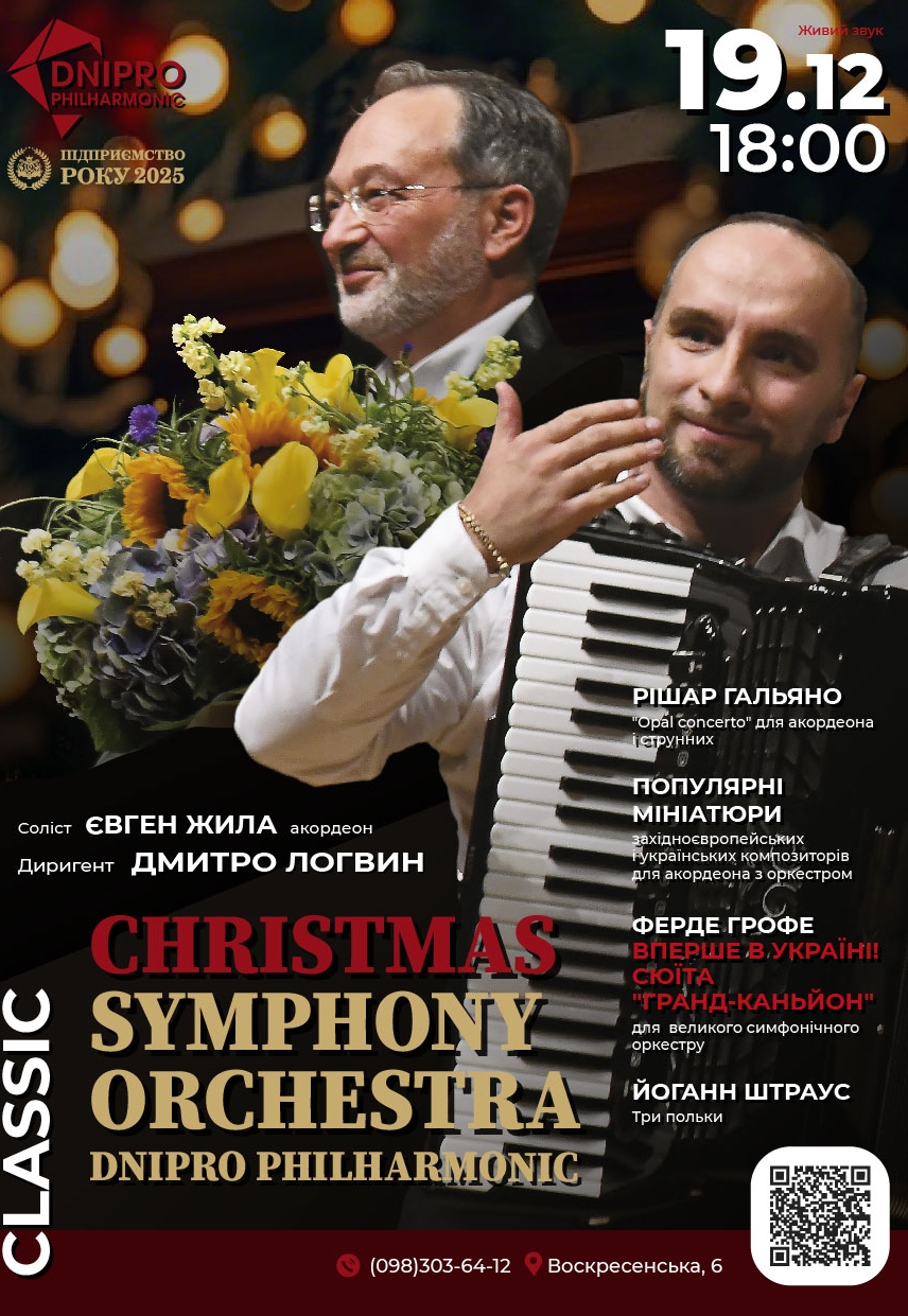 Концерт «Christmas Symphony Orchestra» відбудеться 19 грудня 2025, 18:00, п’ятниця в Дніпропетровська філармонія імені Л. Б. Когана. За допомогою сервісу internet-bilet.ua, Ви зможете з легкістю забронювати, замовити та купити квитки на концерт, спектакль, оперу, балет, майстер-класи, спортивні та дитячі заходи, що Вас цікавлять, оплативши їх найбільш зручним для Вас способом: через інтернет банківською карткою VISA/MasterCard, готівкою або кур'єром, якщо зробите замовлення квитка з доставкою.