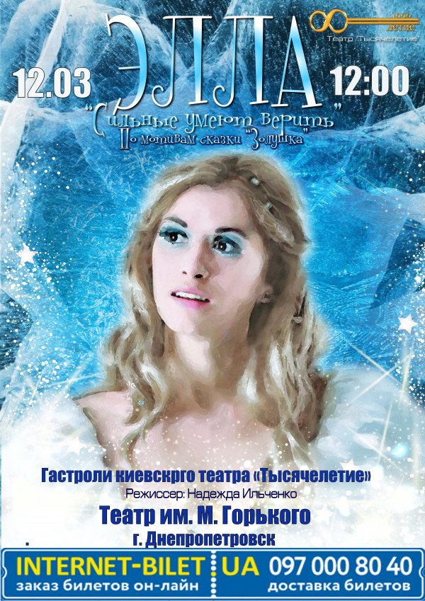 "Элла.Сильные умеют верить" відбудеться 12 березня 2016, 12:00, субота в Дніпровський академічний театр драми та комедії. За допомогою сервісу internet-bilet.ua, Ви зможете з легкістю забронювати, замовити та купити квитки на концерт, спектакль, оперу, балет, майстер-класи, спортивні та дитячі заходи, що Вас цікавлять, оплативши їх найбільш зручним для Вас способом: через інтернет банківською карткою VISA/MasterCard, готівкою або кур'єром, якщо зробите замовлення квитка з доставкою.