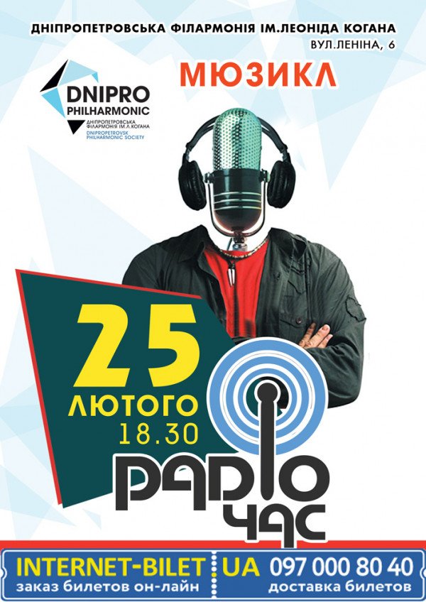 Музыкальное шоу "Радиочас" відбудеться 25 лютого 2016, 18:30, четвер в Дніпропетровська філармонія імені Л. Б. Когана. За допомогою сервісу internet-bilet.ua, Ви зможете з легкістю забронювати, замовити та купити квитки на концерт, спектакль, оперу, балет, майстер-класи, спортивні та дитячі заходи, що Вас цікавлять, оплативши їх найбільш зручним для Вас способом: через інтернет банківською карткою VISA/MasterCard, готівкою або кур'єром, якщо зробите замовлення квитка з доставкою.