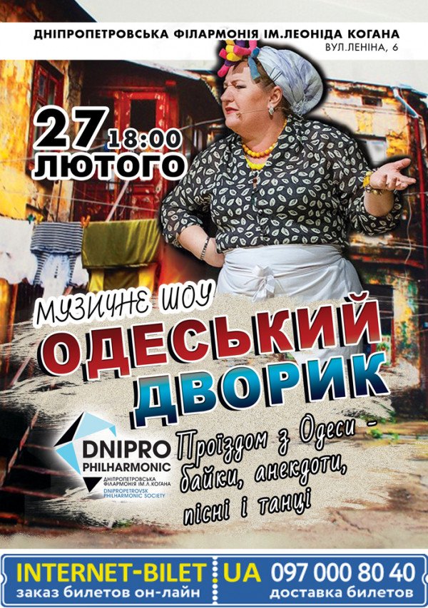 Концерт-шоу «Одесский дворик» відбудеться 27 лютого 2016, 18:00, субота в Дніпропетровська філармонія імені Л. Б. Когана. За допомогою сервісу internet-bilet.ua, Ви зможете з легкістю забронювати, замовити та купити квитки на концерт, спектакль, оперу, балет, майстер-класи, спортивні та дитячі заходи, що Вас цікавлять, оплативши їх найбільш зручним для Вас способом: через інтернет банківською карткою VISA/MasterCard, готівкою або кур'єром, якщо зробите замовлення квитка з доставкою.