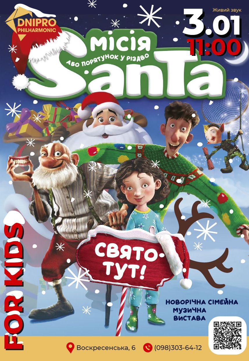 Інтерактивна вистава «Місія Санта або Порятунок у Різдво» відбудеться 3 січня 2026, 11:00, субота в Дніпропетровська філармонія імені Л. Б. Когана. За допомогою сервісу internet-bilet.ua, Ви зможете з легкістю забронювати, замовити та купити квитки на концерт, спектакль, оперу, балет, майстер-класи, спортивні та дитячі заходи, що Вас цікавлять, оплативши їх найбільш зручним для Вас способом: через інтернет банківською карткою VISA/MasterCard, готівкою або кур'єром, якщо зробите замовлення квитка з доставкою.
