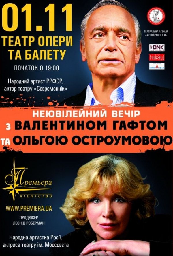 Неюбилейный вечер Валентина Гафта и Ольги Остроумовой відбудеться 1 листопада 2011, 19:00, вівторок в Дніпровський академічний театр опери та балету. За допомогою сервісу internet-bilet.ua, Ви зможете з легкістю забронювати, замовити та купити квитки на концерт, спектакль, оперу, балет, майстер-класи, спортивні та дитячі заходи, що Вас цікавлять, оплативши їх найбільш зручним для Вас способом: через інтернет банківською карткою VISA/MasterCard, готівкою або кур'єром, якщо зробите замовлення квитка з доставкою.