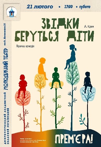 Вистава «Звідки беруться діти». Прем'єра! відбудеться 21 лютого 2026, 17:00, субота в Дніпропетровський академічний молодіжний театр. За допомогою сервісу internet-bilet.ua, Ви зможете з легкістю забронювати, замовити та купити квитки на концерт, спектакль, оперу, балет, майстер-класи, спортивні та дитячі заходи, що Вас цікавлять, оплативши їх найбільш зручним для Вас способом: через інтернет банківською карткою VISA/MasterCard, готівкою або кур'єром, якщо зробите замовлення квитка з доставкою.
