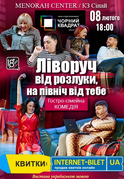 Театр Чорний Квадрат «Ліворуч від розлуки, на північ від тебе» відбудеться 8 лютого 2026, 18:00, неділя в Menorah Center. Зал «Сінай». За допомогою сервісу internet-bilet.ua, Ви зможете з легкістю забронювати, замовити та купити квитки на концерт, спектакль, оперу, балет, майстер-класи, спортивні та дитячі заходи, що Вас цікавлять, оплативши їх найбільш зручним для Вас способом: через інтернет банківською карткою VISA/MasterCard, готівкою або кур'єром, якщо зробите замовлення квитка з доставкою.
