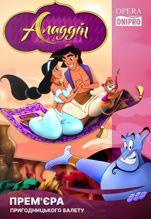 Глядачі поринуть у атмосферу гомінкого східного базару, зустрінуться з підступним чаклуном Джафаром, побачать магічного й всесильного Джина, розкішні скарби Печери Див та легендарний килим-літак, що дарує відчуття справжнього дива. Запрошуємо на подію, що подарує казку і дітям, і дорослим. Балет рекомендовано для молодшого та середнього шкільного віку.