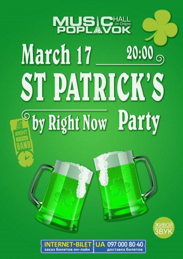День Св. Патрика с RIGHT NOW відбудеться 17 березня 2016, 20:00, четвер в Poplavok Music Hall. За допомогою сервісу internet-bilet.ua, Ви зможете з легкістю забронювати, замовити та купити квитки на концерт, спектакль, оперу, балет, майстер-класи, спортивні та дитячі заходи, що Вас цікавлять, оплативши їх найбільш зручним для Вас способом: через інтернет банківською карткою VISA/MasterCard, готівкою або кур'єром, якщо зробите замовлення квитка з доставкою.
