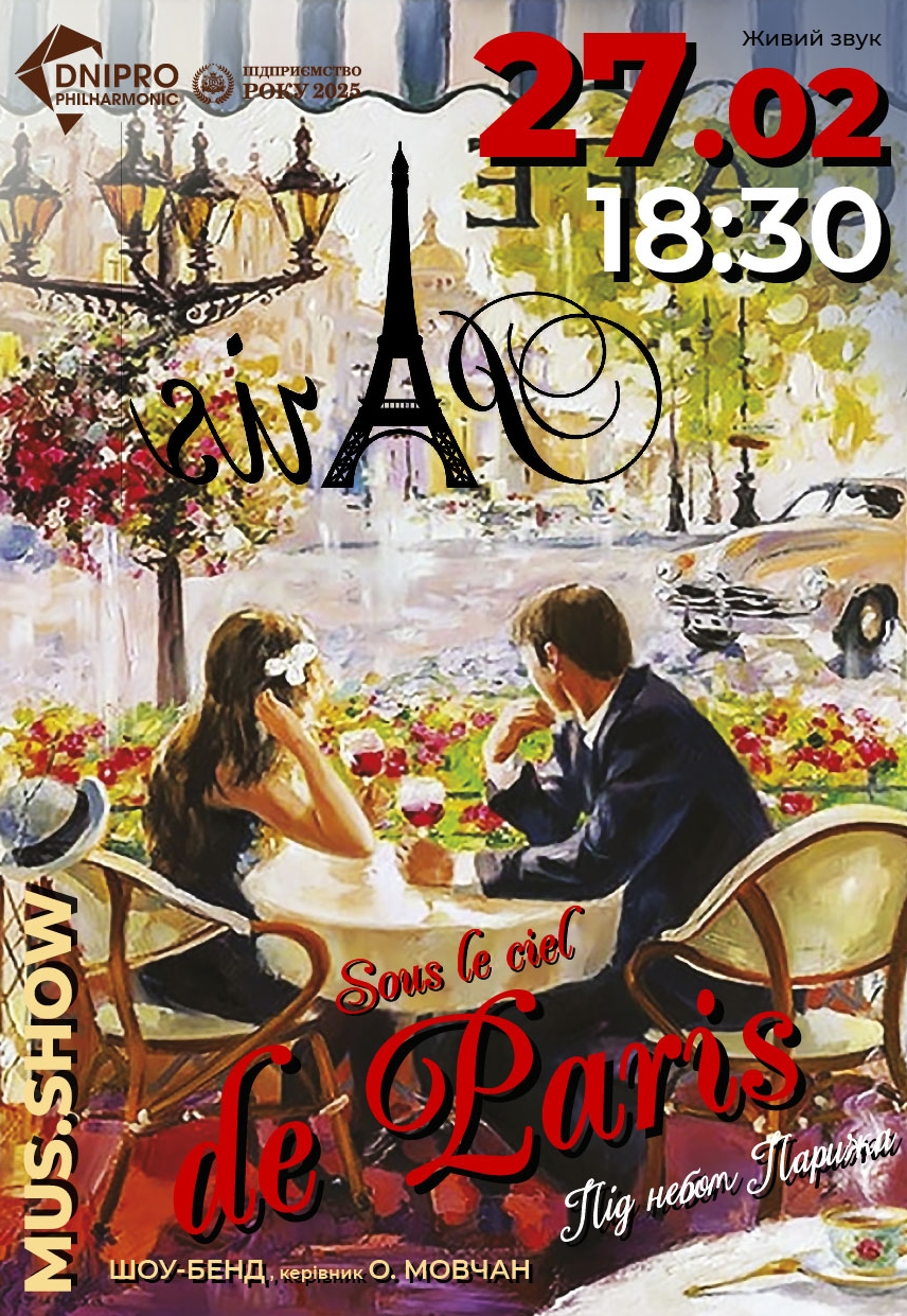 Концерт «Під небом Парижа» відбудеться 27 лютого 2026, 18:30, п’ятниця в Дніпропетровська філармонія імені Л. Б. Когана. За допомогою сервісу internet-bilet.ua, Ви зможете з легкістю забронювати, замовити та купити квитки на концерт, спектакль, оперу, балет, майстер-класи, спортивні та дитячі заходи, що Вас цікавлять, оплативши їх найбільш зручним для Вас способом: через інтернет банківською карткою VISA/MasterCard, готівкою або кур'єром, якщо зробите замовлення квитка з доставкою.