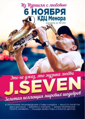 J.Seven ( Евгений Джэй Сэвен, Израиль) – уникальный человек, звезда израильской эстрады, артист, саксофонист, организатор торжеств не только по Тель-Авиву, но и по всему Израилю. J.Seven –не просто музыкант. Искусное владение самым романтичным инструментом – не предел. Помимо этого, он подчинил себе испанскую