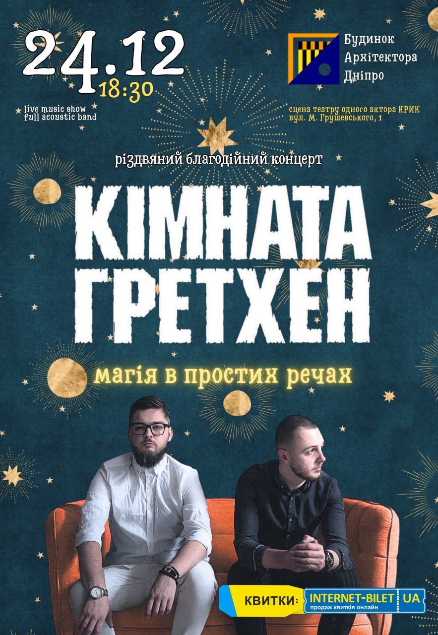 Український інді-рок-гурт КІМНАТА ГРЕТХЕН, відомий своїми поетичними текстами і терапевтичною музикою, відновлює традицію своїх передріздвяних камерних концертів. Музиканти запрошують на благодійний вечір Різдва всіх старих і нових друзів, адже в темні часи хорошим людям треба якомога частіше збиратись разом!