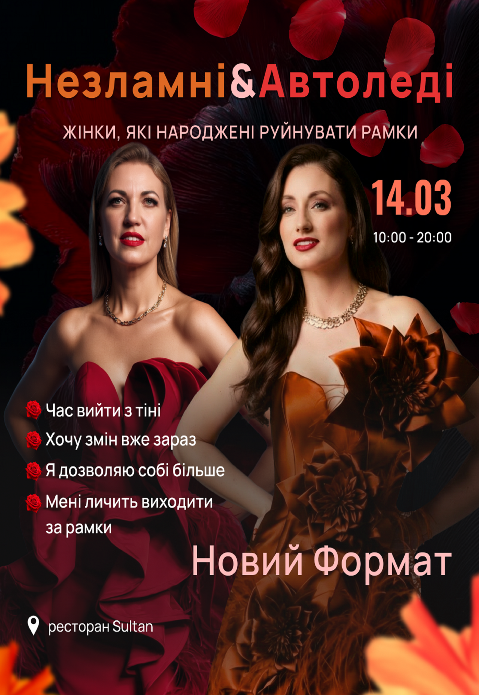 Незламні & Автоледі відбудеться 14 березня 2026, 10:00, субота в Ресторан «Sultan». За допомогою сервісу internet-bilet.ua, Ви зможете з легкістю забронювати, замовити та купити квитки на концерт, спектакль, оперу, балет, майстер-класи, спортивні та дитячі заходи, що Вас цікавлять, оплативши їх найбільш зручним для Вас способом: через інтернет банківською карткою VISA/MasterCard, готівкою або кур'єром, якщо зробите замовлення квитка з доставкою.