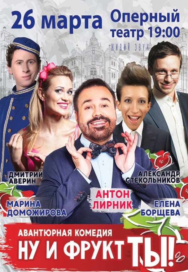 Комедия «Ну и фрукт ТЫ!» відбудеться 26 березня 2018, 19:00, понеділок в Дніпровський академічний театр опери та балету. За допомогою сервісу internet-bilet.ua, Ви зможете з легкістю забронювати, замовити та купити квитки на концерт, спектакль, оперу, балет, майстер-класи, спортивні та дитячі заходи, що Вас цікавлять, оплативши їх найбільш зручним для Вас способом: через інтернет банківською карткою VISA/MasterCard, готівкою або кур'єром, якщо зробите замовлення квитка з доставкою.