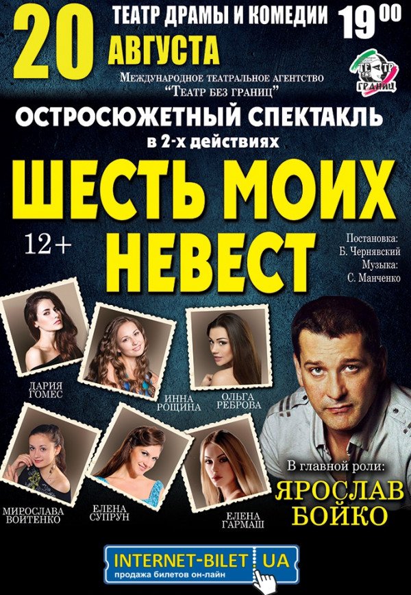 «Шесть моих невест» відбудеться 20 серпня 2017, 19:00, неділя в Дніпровський академічний театр драми та комедії. За допомогою сервісу internet-bilet.ua, Ви зможете з легкістю забронювати, замовити та купити квитки на концерт, спектакль, оперу, балет, майстер-класи, спортивні та дитячі заходи, що Вас цікавлять, оплативши їх найбільш зручним для Вас способом: через інтернет банківською карткою VISA/MasterCard, готівкою або кур'єром, якщо зробите замовлення квитка з доставкою.