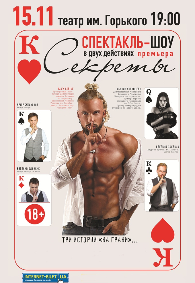 Спектакль-шоу "Секреты" відбудеться 15 листопада 2016, 19:00, вівторок в Дніпровський академічний театр драми та комедії. За допомогою сервісу internet-bilet.ua, Ви зможете з легкістю забронювати, замовити та купити квитки на концерт, спектакль, оперу, балет, майстер-класи, спортивні та дитячі заходи, що Вас цікавлять, оплативши їх найбільш зручним для Вас способом: через інтернет банківською карткою VISA/MasterCard, готівкою або кур'єром, якщо зробите замовлення квитка з доставкою.