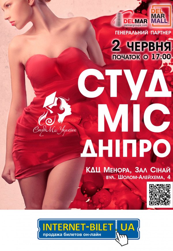 СтудМисс Днепр відбудеться 2 червня 2017, 17:00, п’ятниця в Menorah Center. Зал «Сінай». За допомогою сервісу internet-bilet.ua, Ви зможете з легкістю забронювати, замовити та купити квитки на концерт, спектакль, оперу, балет, майстер-класи, спортивні та дитячі заходи, що Вас цікавлять, оплативши їх найбільш зручним для Вас способом: через інтернет банківською карткою VISA/MasterCard, готівкою або кур'єром, якщо зробите замовлення квитка з доставкою.