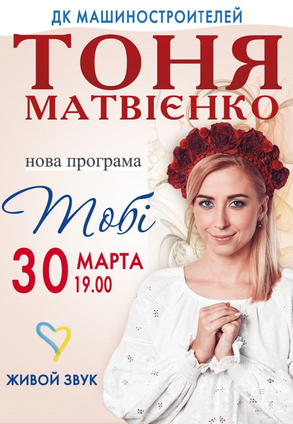 Тоня Матвієнко відбудеться 30 березня 2017, 19:00, четвер в ПК Машинобудівників. За допомогою сервісу internet-bilet.ua, Ви зможете з легкістю забронювати, замовити та купити квитки на концерт, спектакль, оперу, балет, майстер-класи, спортивні та дитячі заходи, що Вас цікавлять, оплативши їх найбільш зручним для Вас способом: через інтернет банківською карткою VISA/MasterCard, готівкою або кур'єром, якщо зробите замовлення квитка з доставкою.
