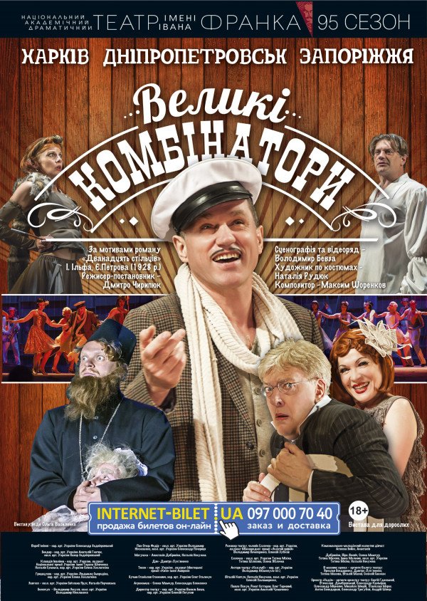 Великие комбинаторы відбудеться 28 жовтня 2015, 19:00, середа в Дніпровський академічний театр опери та балету. За допомогою сервісу internet-bilet.ua, Ви зможете з легкістю забронювати, замовити та купити квитки на концерт, спектакль, оперу, балет, майстер-класи, спортивні та дитячі заходи, що Вас цікавлять, оплативши їх найбільш зручним для Вас способом: через інтернет банківською карткою VISA/MasterCard, готівкою або кур'єром, якщо зробите замовлення квитка з доставкою.