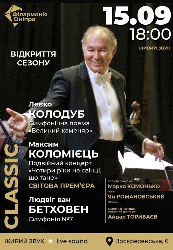 Шановні друзі! Цього вечора запрошуємо вас на неймовірної краси Великий симфонічний концерт-відкриття сезону з хвилюючою програмою, що подарує колосальну музику, вражаючу виконавську майстерність, безліч позитивних вражень та незабутніх спогадів!